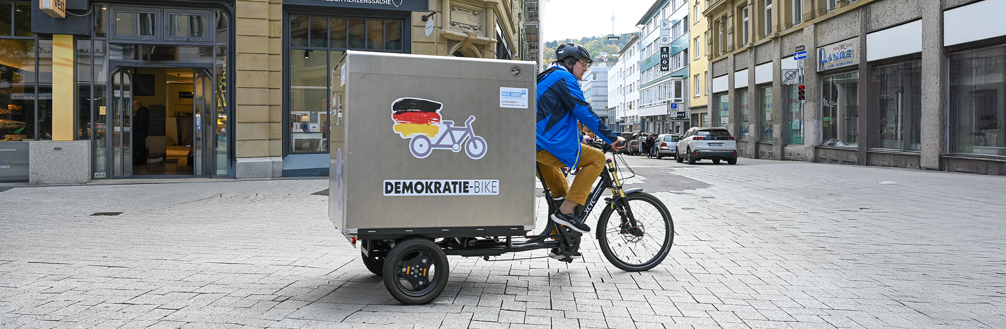 Das Demokratie-Bike steht am 3., 10. und 17. Dezember von 12-15 Uhr an der St. Maria-Kirche in Stuttgart